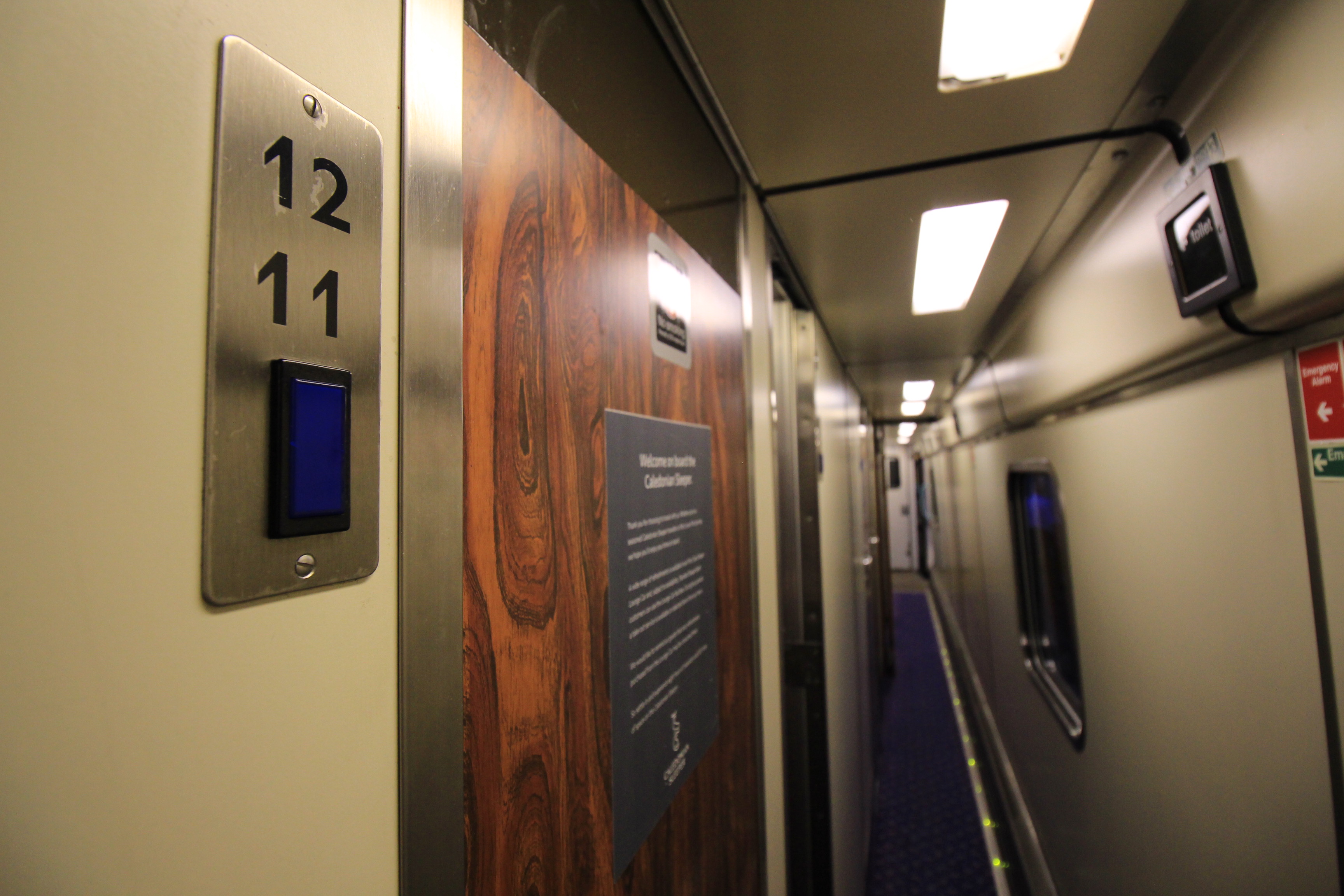 Couloir du Caledonian Sleeper dans un wagon de cabines ; on note l’étroitesse du couloir