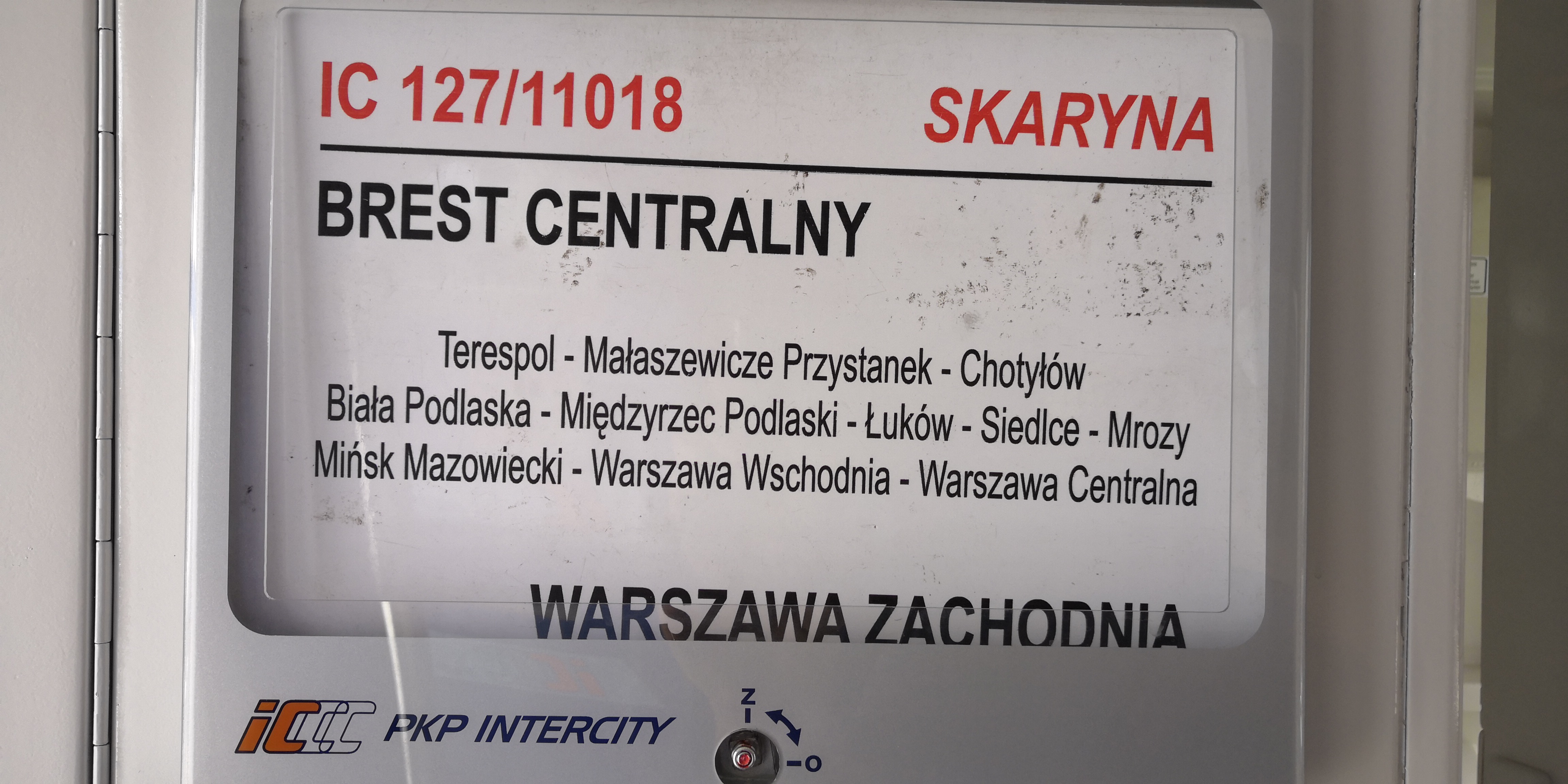 Panneau dans le train Brest ⇄ Varsovie Brest Centralny Warszawa Zachodnia IC 127/11018 Skaryna