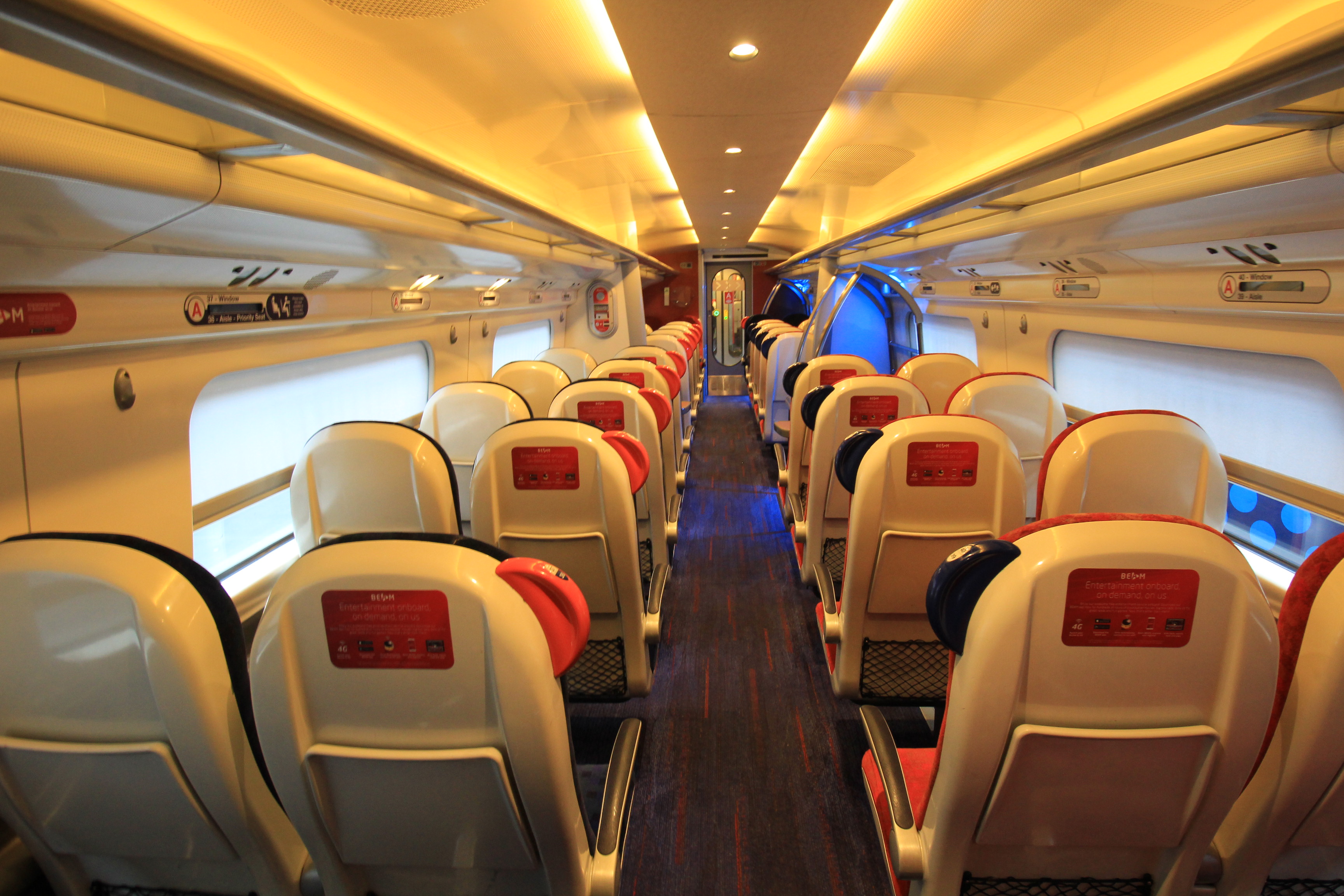 Intérieur d’une voiture de seconde classe (quiet zone) du train Londres ↔ Glasgow de Virgin Trains