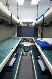 Sièges non inclinables, compartiments à 4 ou 6 couchettes, cabines pour 1, 2 ou 3 avec un lavabo privé. En cabines et compartiments, des draps sous cellophane sont fournis.